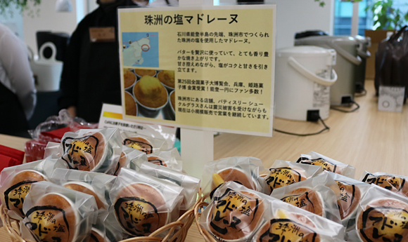 Dandiesカフェではコーヒーなどの飲み物の他に毎回お菓子も提供。「コラボカフェ」では復興支援企画の一環として能登のパティスリーが作った「珠洲の塩マドレーヌ」が用意されました。