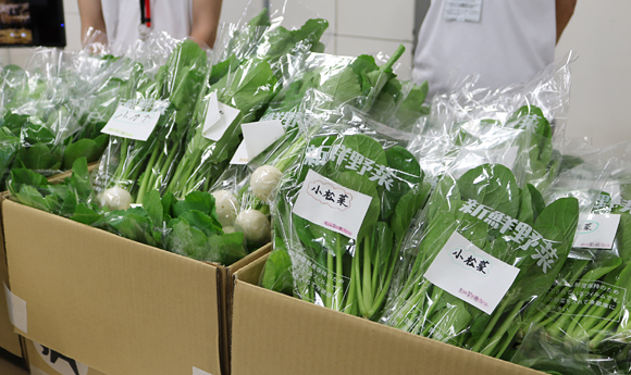袋詰めされた小松菜や小カブ、パクチーなど新鮮な野菜が並びました。値段は、一袋 “100円~(+気持ち)” で、売り上げは全額日本赤十字社に寄付されます。
