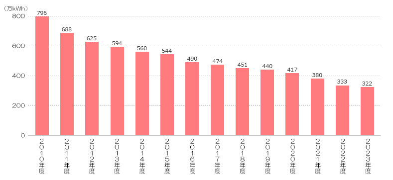 データセンターを備えるひばりヶ丘事業所は電気使用量が多く、コスト・環境負荷の面から課題とされていました。そこで、2011年からESCO事業者の協力のもと省エネルギー施策を実施。空調インバータ制御の導入、照明設備の省エネ化等の施策を行うことにより、電気使用量を2013年度比4割以上削減しました。